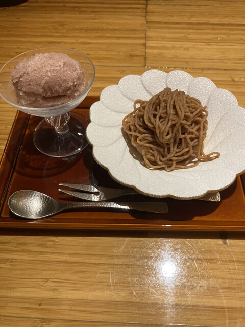 水菓子は、赤ワインと無花果のシャーベットに梨のコンポートに白玉の栗のクリーム掛け。シャーベットは、無花果の甘さを赤ワインの酸味で柔らげ、優しく味わうことができた。梨のコンポートも爽やかな甘味がいい。白玉の栗クリームは掛けは、栗の濃厚で芳醇な旨味が広がり、とても好みの一品。最後まで美味しく頂いた。