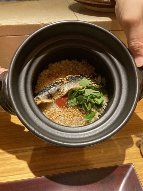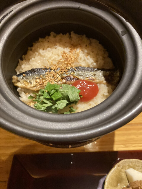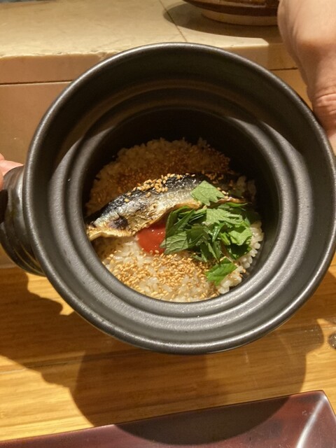 香の物が用意され、その後、釜飯が運ばれてくる。この日の釜飯は、秋刀魚の炊き込みご飯。大将が釜の蓋を開けると、出汁や米、秋刀魚の香りとともに、梅の芳しい香りがふんわ立ち昇ってくる。まさに秋を感じさせてくれる。焼いた秋刀魚を炊き込み、胡麻に梅肉と紫蘇があしらわれている。大将が秋刀魚をよく混ぜ込み、茶碗によそってくれる。茶碗からいい香りが漂う。赤出しも用意されて来たので、早速ご飯を頂く。秋刀魚と出汁の旨味が米に染み込み、そこに梅の香りが広がり、とても上品で美味しく仕上がっている。赤出しや香の物も美味しい。