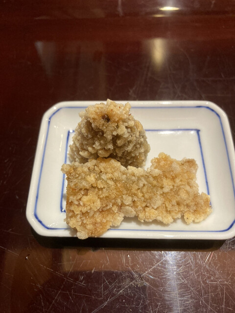 子持ち鮎の揚げ物を食べ終わった頃合いを見計らい、先程の子持ち鮎の頭と尾っぽの部分を揚げたものが供される。かぶり付くと、骨までしっかり揚がっていて、香ばしさが心地よい。日本酒が進む。