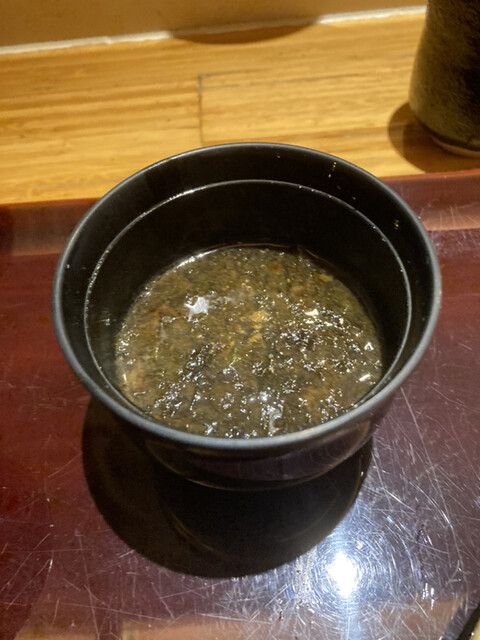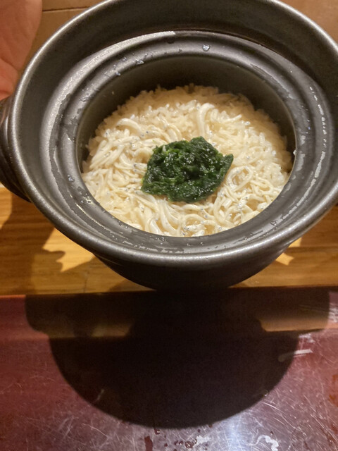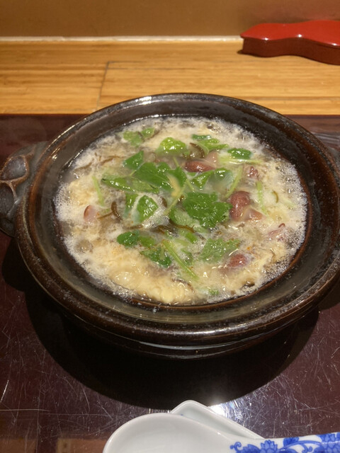 こちらの店のスペシャリテである鍋、この日は、蛍烏賊と海蘊の玉締め。出汁を張ったところに海蘊と蛍烏賊を入れ、沸騰したところで溶き卵で締め、三つ葉を散らしたもの。熱々で供される。これまた春の訪れを感じさせる。むっちりした蛍烏賊は、身もわたも旨味たっぷりだし、また、鍋で頂く卵で包まれた海蘊がこんなに旨いとは驚いた。日本酒を楽しみながら、鍋の出汁まで残さず頂いた。