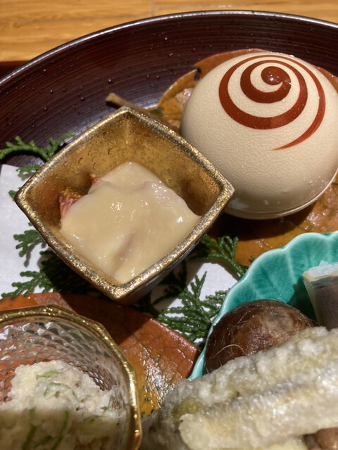先付は、鯛の酒蒸し、海老芋と湯葉と餅銀杏が添えられ、霰ポン酢餡が掛けられている。鯛は、滋味深い味わいを称え、その味わいをポン酢餡が引き立てており、とても旨い。
