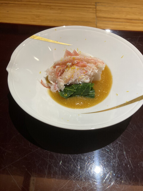 先付は、ずわい蟹。聖護院蕪と青菜が添えてあり、柿を裏漉しして加減酢で溶いた柿酢が器の底に敷いている。柿酢を絡めて頂く。しっかりした蟹の旨味が柿酢とよく合い、美味しく頂けた。