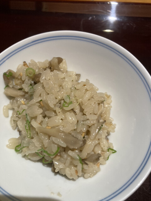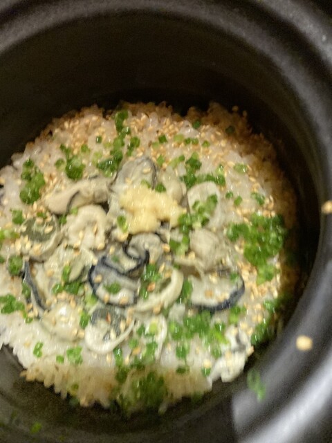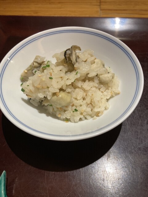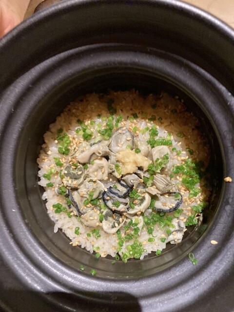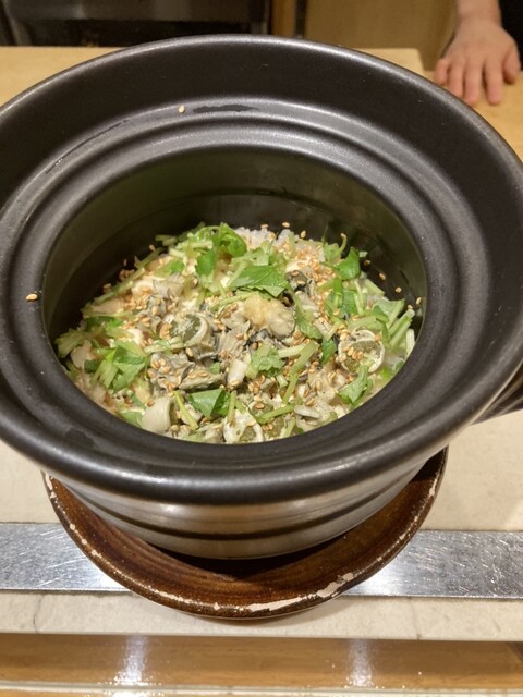 最後に、土鍋で炊いた牡蠣ご飯。それに香の物として昆布、水菜、沢庵が添えられ、青さの味噌汁が用意される。大将が土鍋にふたを開けると、牡蠣と出汁のいい香りが立ち昇ってくる牡蠣は程よい大きさ。そこに小口葱が刻んであり、胡麻が振りかけられている。かわいい女将さんが茶碗によそってくださる。一口頂くと、牡蠣の香りが口から鼻腔、食道に広がり、その後、濃厚な牡蠣の旨味が口一杯に感じる。香の物や味噌汁を頂きながら、牡蠣ご飯を頂く。一膳食べ終わったところで、お代わりしようかかなり迷ったが、家でもこの牡蠣ご飯を味わいたいと思い、残りはおにぎりにしていただいた。本当に美味しいご飯を頂くことができた。