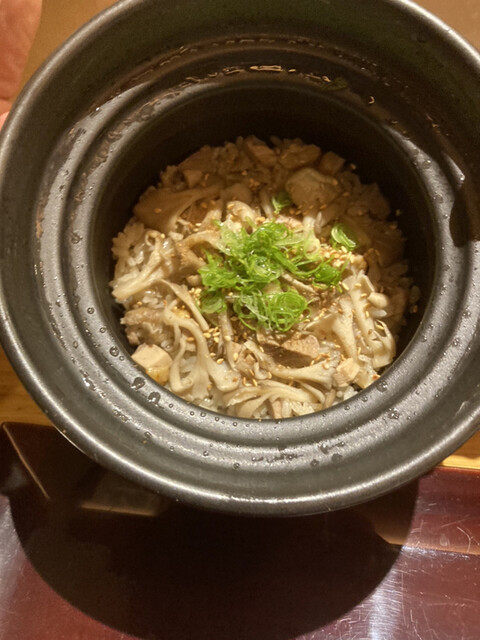 釜飯は、米の一粒まで鶏の旨味が染みており、そこに舞茸の香りを纏わせている。素朴だけと、間違いなく旨い。赤出しや香の物との相性もいい。ボリュームたっぷりだが、最後まで美味しくいただけた。