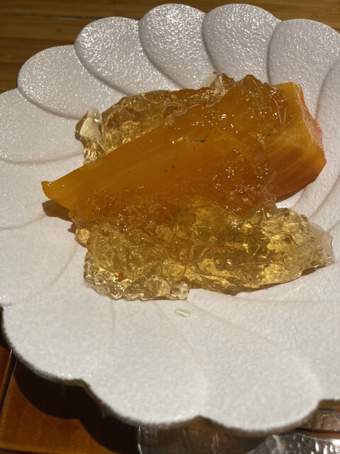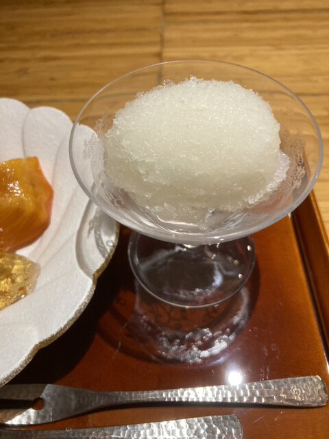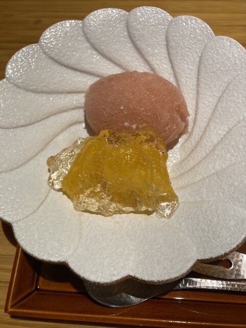 水菓子は、酢橘とシャンパンのシャーベットに、奈良産柿とブランデーのジュレを添えたもの。柿はかなり熟していて、崩しながらジュレと頂く。和と洋が融合し、お洒落な味わいで、最後まで楽しめた。