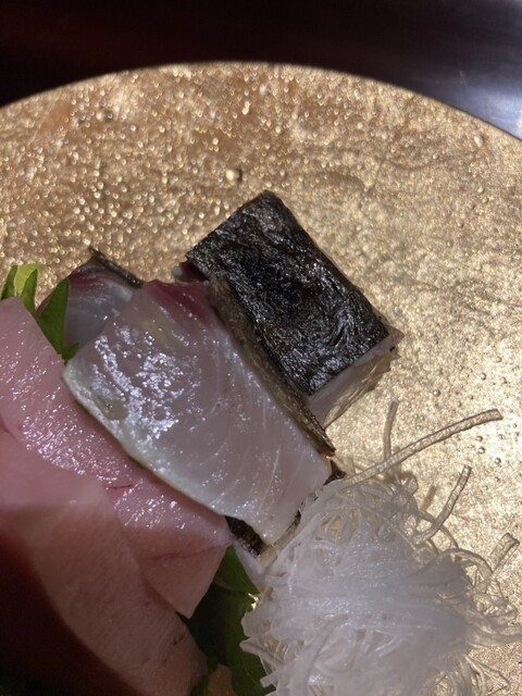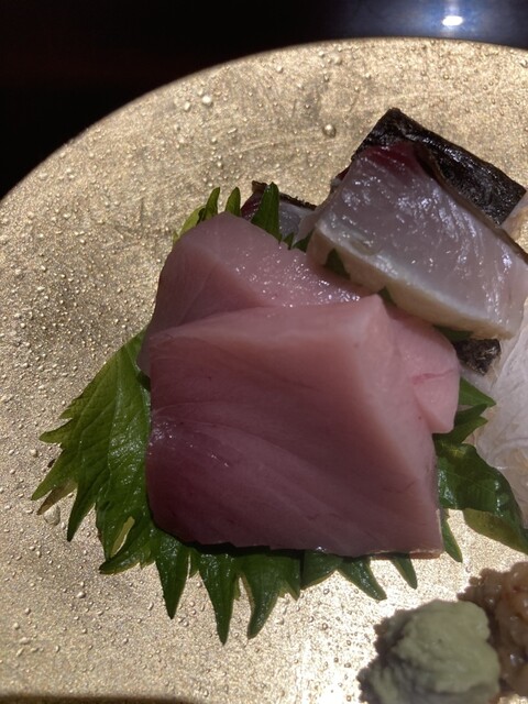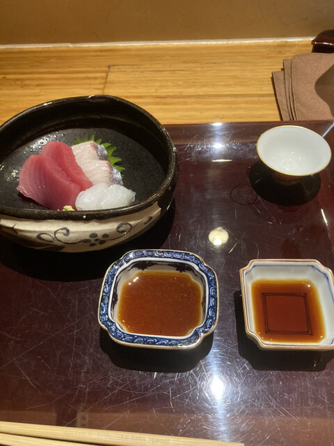 鮃は、活かったものではなく、程よく熟成させてあり、ポン酢で頂くと白身の大人の旨味を感じる。また、横輪は、キメ細やかな脂が乗っている部分と赤身のグラデーションが美しい。口に入れると、品のよい脂の旨味と赤身の力強い味わいが広がる。いずれも、とても美味しい。日本酒が進む。