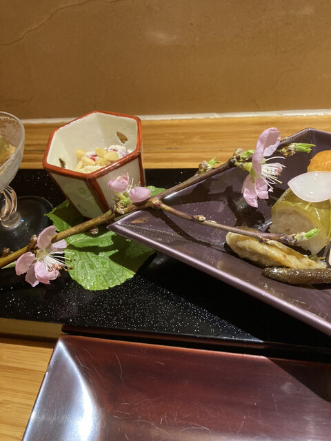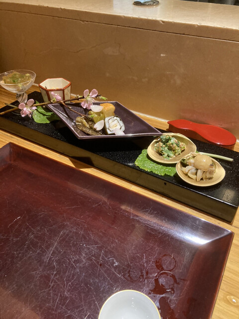 八寸は、心斎橋の桝田を彷彿とさせる長い皿で供される。桜の花や山葵の葉が飾られており、春の訪れを美しく表現している。料理は、浅利と花山葵酢味噌和え、菜花胡麻和え、鮃龍日巻、諸子甘露煮、いさざ南蛮漬け、花びら百合根、桜寿司、厚焼き玉子、苺と林檎の白和え松の実添え、煮穴子の煮凝りがきれいに盛り込まれている。