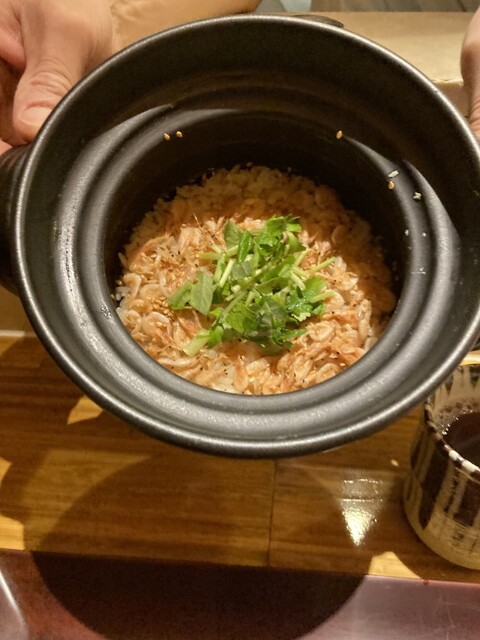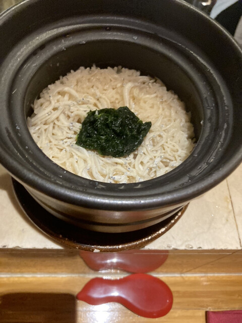 飯物は、桜海老の炊き込みご飯。これに赤だしと香の物が付く。炊き込みご飯は、桜海老の風味がとてもよく、香ばしさが米に染み込み、とても旨い。お代わりしようと思ったが、家に帰っても味わいたく思い、残りをおにぎりにして頂いた。