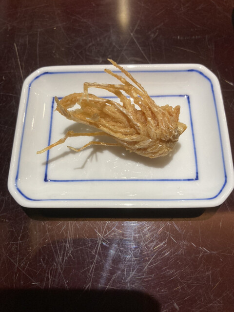 先付を食べ終わると、先程の白沙海老の頭が天ぷらにされて出される。大将曰く、大人のカッパ海老せん。海老の旨味と香ばしさが凝縮していて、日本酒にとてもよく合う。