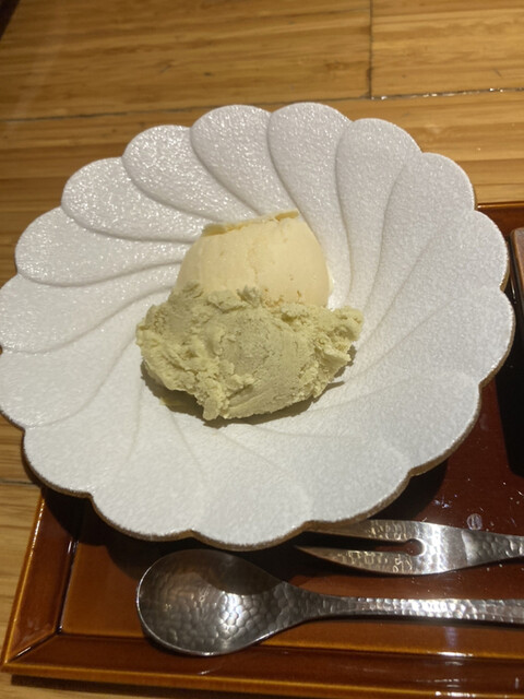 〆の水菓子は、和三盆のアイスに桜の葉を練り込んだアイスそして鶯餅。桜の花を練り込んだアイスは、塩味が効いていて、和三盆のアイスと交互に食べるととてもおいしい。鶯餅もアイスも春を告げる季節感あふれるお菓子。最後まで満足した料理だった。