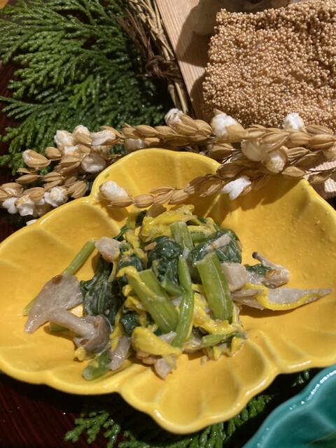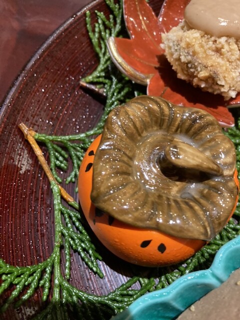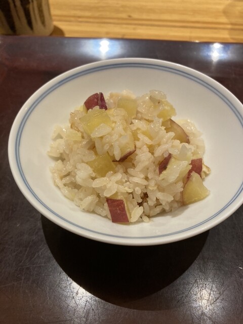 八寸の最後に梨と柿の白和え、薩摩芋きんとんを頂く。二種の果物の優しい甘さに塩味が付いた白和えは、なんだか大人の味わい。大好きな一品である。また、きんとんはデザートのように甘く、ゆったりした気分にさせてくれる。
