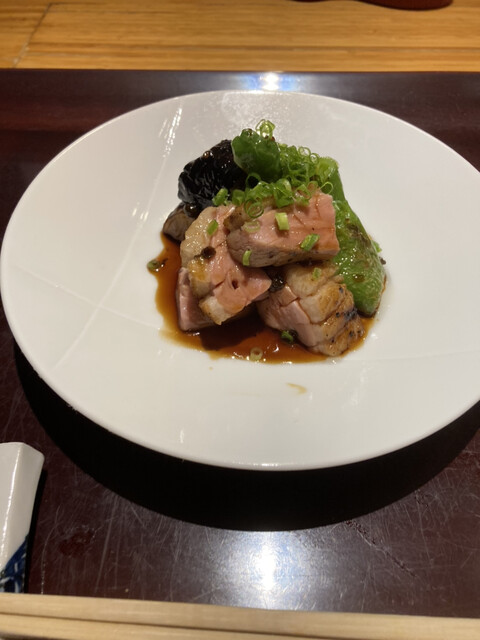 八寸を食べ終わり、しばらくすると、焼き物が用意される。大好きな鴨と茄子、万願寺唐辛子の山椒焼き。まずは鴨を焼き、茄子と万願寺は油通しした後、鴨と一緒のフライパンに入れて焼き、鴨の脂を吸わせ、醤油や山椒などで味を整える。鴨は、間違いなく旨いが、茄子は鴨の脂を吸い、蕩けるような食感で、これまた間違いなく旨い。