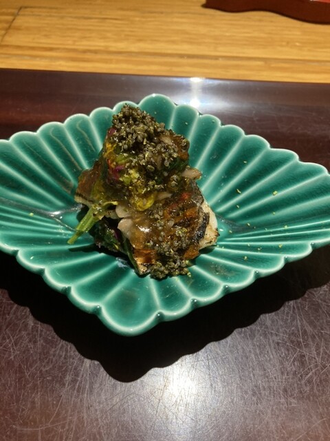油物は、子持ち鮎の揚げ物。霰をまぶして揚げ、そこに、蓮根、銀杏が添えられている。これを山椒醤油で頂く。初夏の鮎のような胡瓜に似た香りはしないが、その分、卵をいっぱいはらんでいて、まるで熟女のような味わいを感じる。山椒醤油に付けて頂くと、卵や身の旨さがくっきりと感じられる。