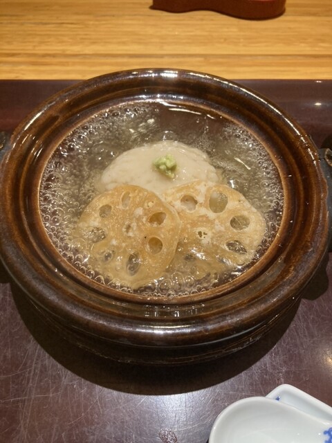 続いて、こちらね店のスペシャリテてある一人鍋は、鰆のはす蒸し。今からが旬の鰆にすりおろした蓮根饅頭の中に入れ、淡い出汁で煮た後に素揚げした蓮根を添えて山葵を乗せて供される。早速熱々のところを頂く。脂が上品に乗った鰆の下味に、はすの食感、それをまとめる淡い出汁が渾然一体となって、口の中で旨味が広がる。また、蓮根の素揚げも香ばしく、よいアクセントになる。優しくてほっこりした一品。日本酒と合わせて頂くと、鰆の旨味が広がりを見せる。出汁まで残さず頂いた。