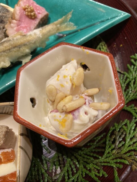 先付は、白沙海老に無花果と柿、胡桃の白和え。秋を感じる一品。無花果や柿の優しい甘さに海老の旨味が一層引き立つ。ほっこりした旨味を感じる。