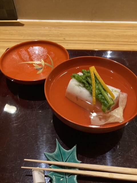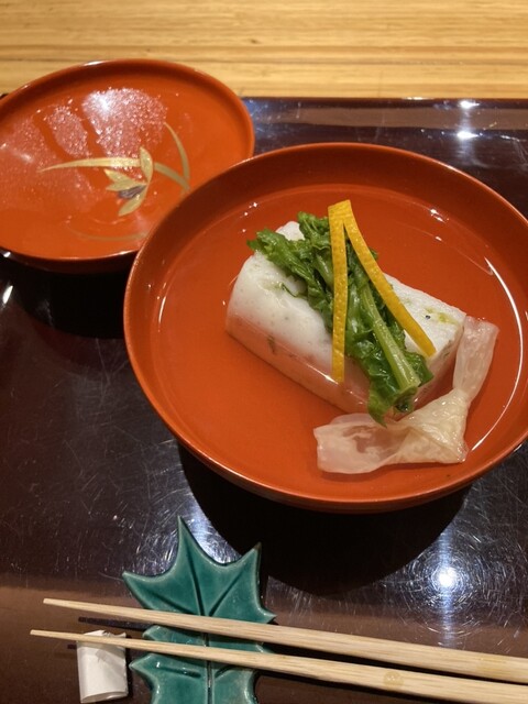 続いて、椀物。椀種は、鰆とかるかん真薯、舞茸、蓮の実、水菜。これに酢橘の皮を卸したもので風味付けしている。