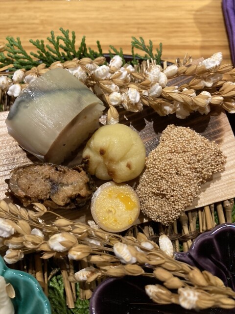 銀杏豆腐は心地よい弾力とほろ苦さが出汁とよく合う。湯葉イクラは、イクラの食感と湯葉の食感のコントラストが楽しい。法蓮草と茸の和え物は、シンプルだけど和の基本が詰まっている。鴨は滋味深く間違いなく旨いし、鯛芥子揚げも鯛の旨味が凝縮されている。鶉卵燻製は酒の肴に合うし、鯖小袖寿司も脂の乗った程よい漬かり加減の鯖で素晴らしい出来栄え。きんとんは優しい味わい。そして、稲の揚げた米が美味くて、手が止まらない。品がないかもしれないが、余すことなく、揚げた米を頂いた。