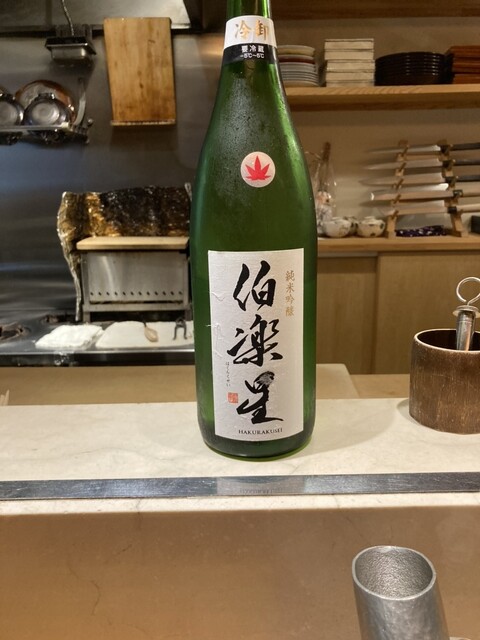 日本酒を飲みながらゆっくりと頂く。日本酒が空いたので、伯楽星の純米吟醸を頂く。竹筒の形をした錫の酒器が懐かしい。こちらの酒も昔からの好みである。