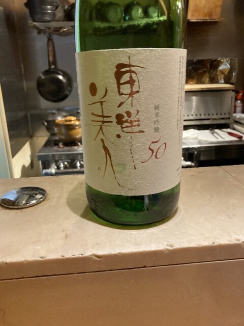 いつもの席に案内される。メニューを見て、まずは、日本酒東洋美人純米吟醸を注文する。錫で設えた竹筒の酒器に日本酒を入れ、氷を張ったガラスのボールに酒器を立て掛けて供される。フルーティで香り高い、好きな酒である。