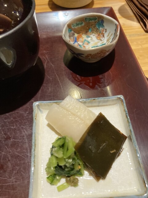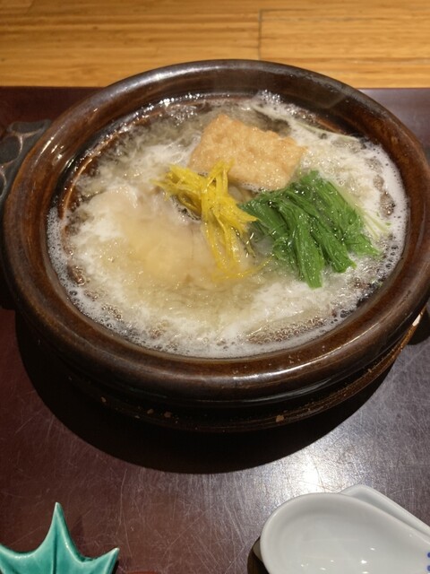 こちらの店のスペシャリテであるこの日の鍋は、鱈と厚揚げの蕪霰卸しの小鍋。柚の千切りと水菜が添えられている。旨味の乗った鱈に、蕪の霰卸しが絡み、柚薫る出汁とともに頂くと、ああ旨いなと素直に思う。蕪が雪を表し、来るべき冬景色を熱々の鍋で表現している。出汁まで残さず頂いた。