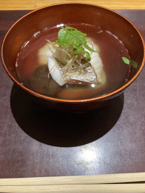 椀物は鯛煮麺と蓬豆腐。茗荷と山椒があしらわれている。熱々を頂く。出汁加減は丁度いい塩梅。鯛は、腹身の部分で、しっとりしていて鯛本来の旨味が熱々の出汁の活性化され、美味しい。蓬豆腐もほんのり感じる苦味が、出汁によく合う。今回も旨い椀物が頂けた。