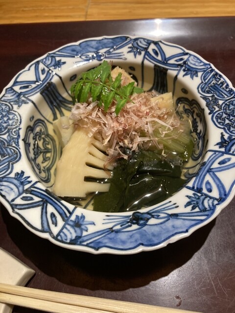 留の料理は、若竹煮、わかめと蕗が添えられ、鰹節と山椒が乗せられている。筍を炊いた出汁は、少し甘めの優しい味わい。筍の風味、旨味がとてもよくわかる。蕗のほろ苦さやわかめの優しさも心地よい。最後は出汁まで飲み干した。
