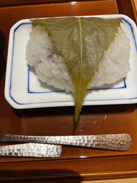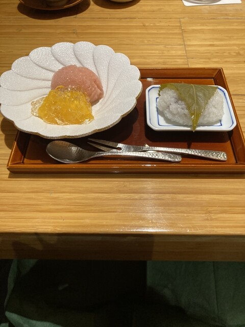 水菓子は苺とシャンパンのシャーベットに清美オレンジのジュレ掛け、そして桜餅。シャーベットやオレンジは爽やかで、口の中がさっぱりとする。驚いたのは桜餅。今蒸されたかのような暖かさで、塩漬けの桜葉の香りが芳しい。蒸し立ての餅の道明寺粉や餡は驚くほど美味い。季節感溢れる一品で締めることができた。