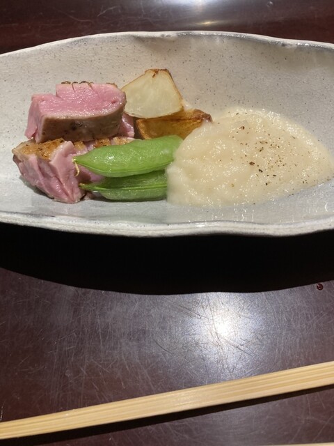 まずは、ソースを絡めて鴨を頂く。中がルージュに仕上げた鴨の濃厚な旨味はとても素敵だが、新玉ねぎのソースが抜群に旨い。何でも、刻んだ新玉ねぎを時間をかけて色が変わらないように炒め、それを出汁に入れて塩と薄口醤油で味を整えて、滑らかになるまで煮込んだものだそう。甘くてクリーミー、そこに胡椒の風味も活きてきて、鴨そのものの旨味にソースの旨味が重なってくる。鴨だけでなく、豌豆やじゃがいも、芽キャベツなどの野菜にもよく合う。ソースまで残さず頂いた。驚きの一品である。無論日本酒によく合う。
