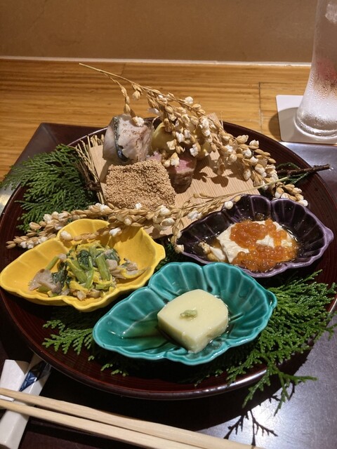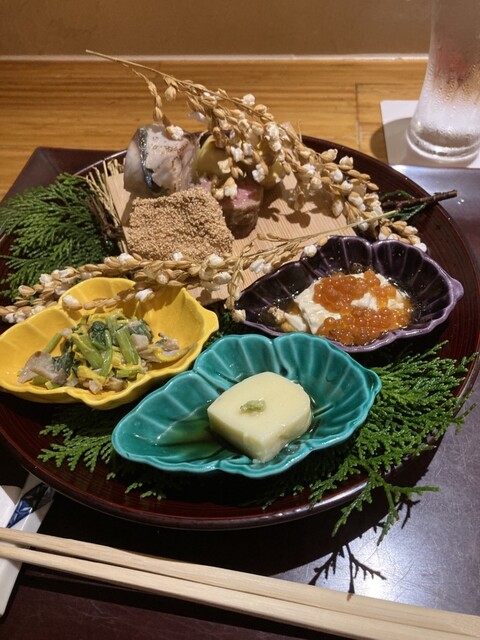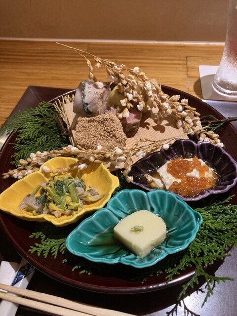 続いて、八寸が用意される。秋の装いで華やかな中に、旨いものが綺麗に盛り付けられている。料理は、銀杏豆腐、湯葉鱒イクラ掛け、法蓮草と茸の和え物、鯖小袖寿司、鴨辛子添え、鯛芥子揚げ、鶉卵燻製、芋きんとん、そこに稲穂を揚げたものが添えられている。稲穂の米は白く揚がり、軽く塩味がつけられている。