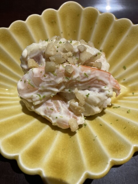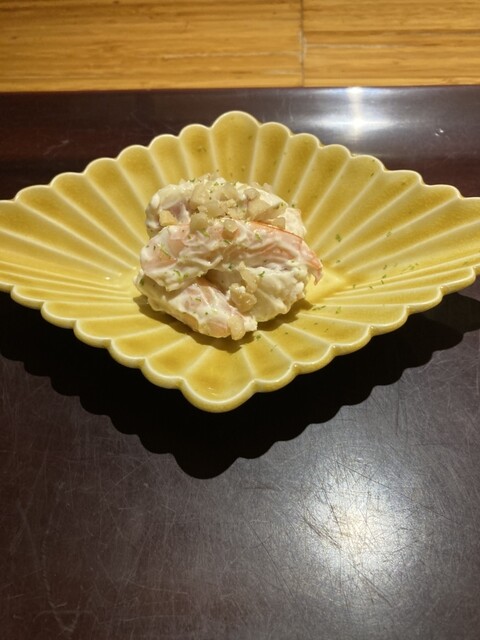 先付は、白沙海老の豆打和え。原木椎茸、ヤングコーン、小芋、胡桃などが一緒に和えられている。まずはひと口。品の良い海老の旨さと、豆打のまろやかさが、うまく調和して、とても美味しい。椎茸やヤングコーンなども旨味十分で、これからの料理への期待が高まる。