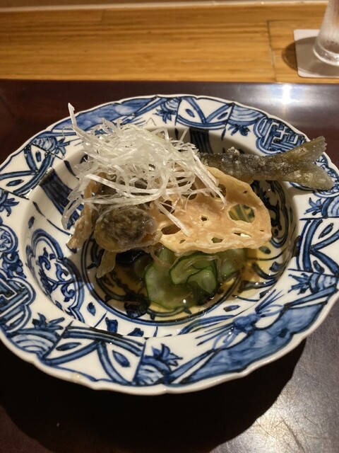 向付が終わると、先付で頂いた白沙海老の頭のから揚げが供される。これぞ。まさに大人のかっぱえびせん。不味かろうはずは無い。もっと食べてみたいと素直に思う。