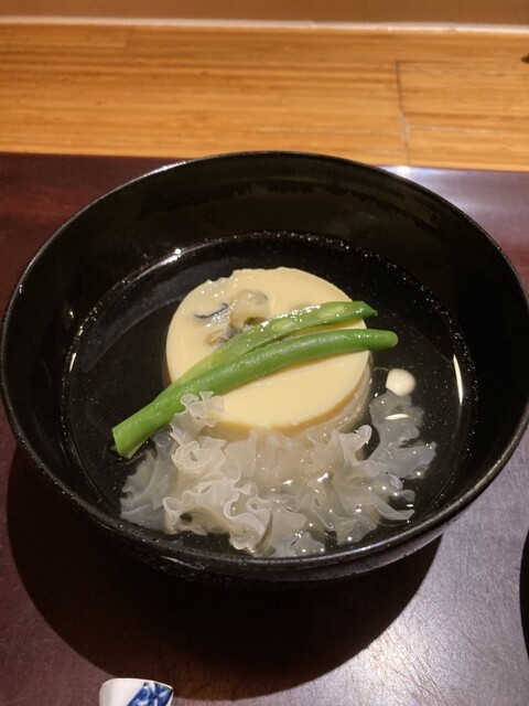 椀物は、鼈豆腐、白木耳、隠元。生姜が添えてある。出汁はやや淡め。軽く生姜を溶いて、鼈豆腐を頂く。鼈を生姜醤油で炊いたものを卵豆腐の中に入れたもの。豆腐を割ると鼈の脂、旨味が出汁に広がる。鼈の身を頂く。濃厚な旨味が広がる。周りの卵豆腐は滑らかて優しい味わい。白木耳は、その歯触りが楽しい。熱々を一気に頂いた。旨い椀物で、感動を覚えた。