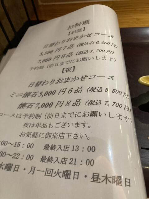 こちらのお料理は、高価な食材でなく、旬の食材を使い、食材が一番映えるお料理を提供してくれており、実直て季節感溢れる旨さを感じることができる。また、大将のユーモア溢れる中にも料理人としての矜持を感じる応接や美人で優しい女将の柔らかな接遇も素晴らしい。また、季節毎に訪れて、美味しい料理と大将夫妻の素敵なもてなしを楽しみたい。
