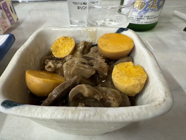 続いて熱々の鶏モツ煮込み。甘辛い出汁が日本酒に合う。
