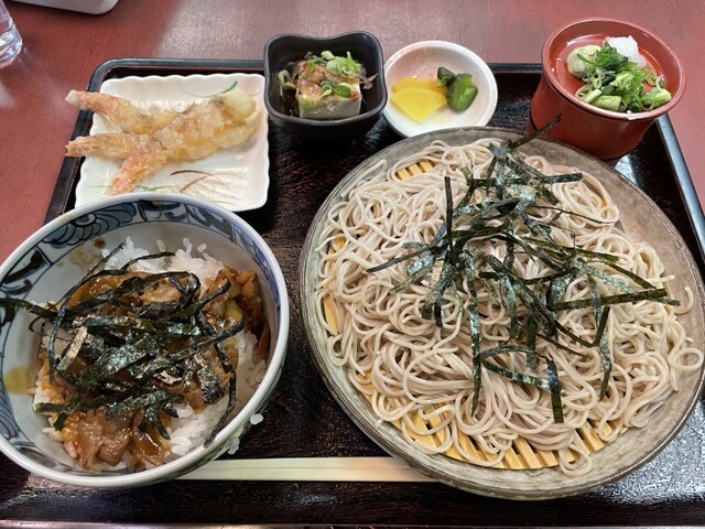 日本蕎麦ざると焼肉丼に小海老天麩羅が付いてる。