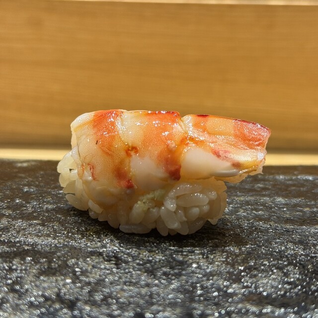 ココからはいよいよ握りがスタート、まずは車海老、なかなかお目にかかることができないすごく大きな車海老、これをレアな状態のものと茹でたものの二種類で出してくれます。レアな方はフレッシュ感があって甘みがすごく強い、茹でた方もぷりぷりの歯ごたえがたまりません。