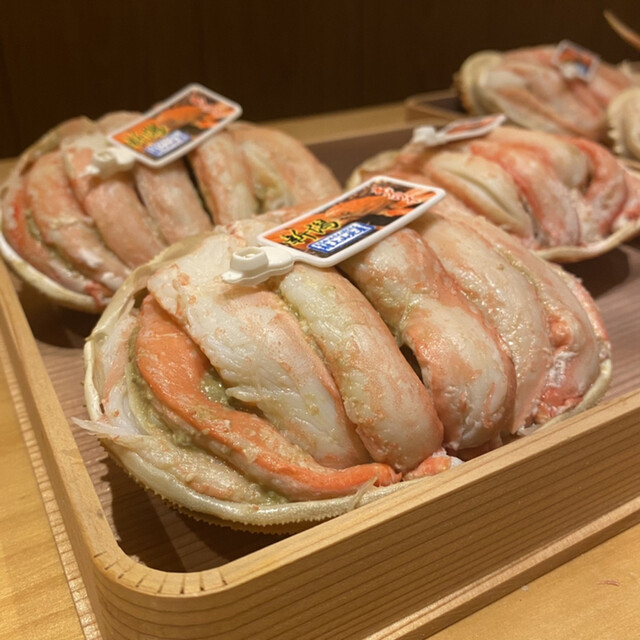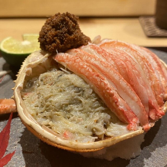 次に毛蟹の甲羅盛り、甲羅には胴体のお肉にほぐした脚身、それに蟹味噌がギュウギュウに詰まっていてその上にさらに脚の身といった見た目以上にたっぷりと堪能できます。味の方も身の甘みに味噌の深みが感じられてすごく美味しいです。