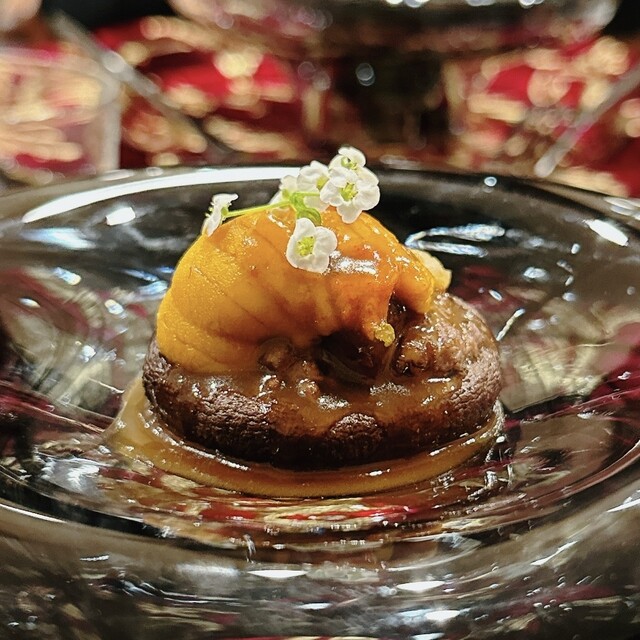 食材も豪華ですがやはりシェフの腕が違いますね、最初から最後までどの料理も文句なしに美味しかったですが、いくつかピックアップして感想を書かせてもらうと、まずは一品目として出てきた香箱蟹のティラミス、トップにはお豆腐と生の落花生をペーストにしたソース、さらには蟹の殻を乾かせて粉末にしたものをかけてあり、確かにティラミスのようなイメージですが、その下には香箱蟹のすべてが隠れています。一番下にほぐしたカラダの身、その次に内子、その次に足の身、一旦生地を挟んでその上に外子と、余すことなく蟹を堪能することができました。