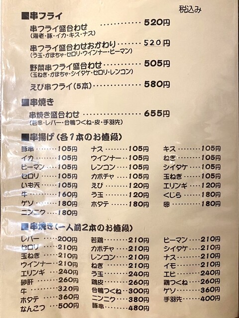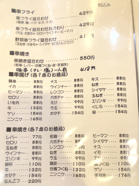 串はカウンターのケースに並んでて焼きは2本、揚げは1本から注文可能。