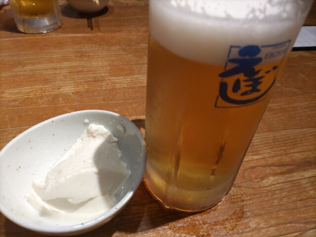 生ビール、お通し塩豆腐、友達はソフトドリンクでつかないのでわけた、