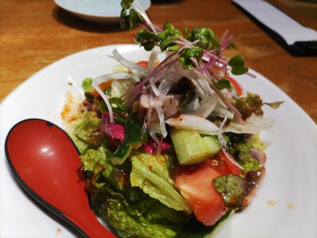 カツオたたきサラダ。850円キムチからめて、めちゃおいしい!