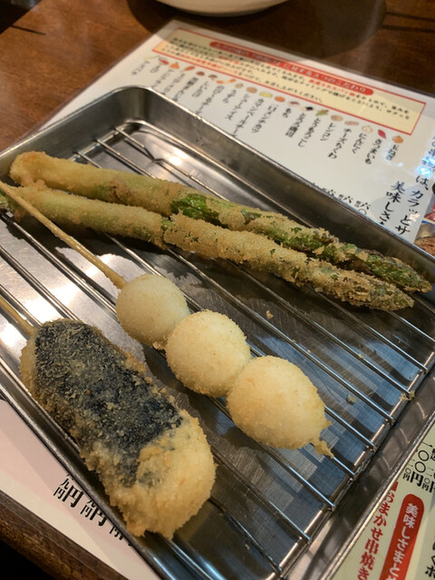 串揚げ:いろいろ野菜を中心に串揚げを…串焼きと違ってサクサクの食感はやはり美味しい。