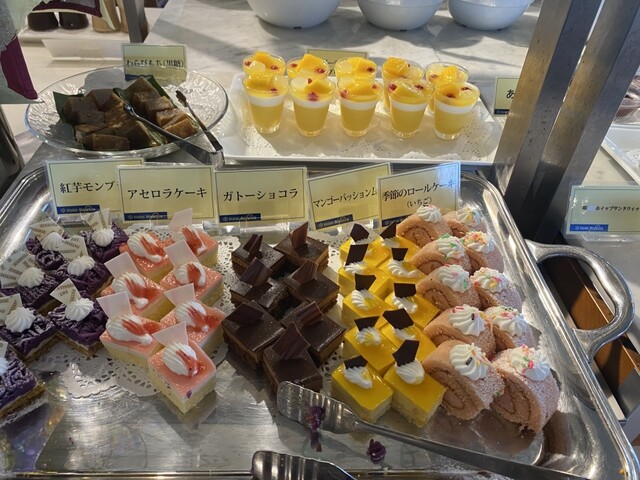 フルーツ、ケーキ、シュークリーム、サンドイッチ、和菓子、アイスクリームと幅広く多彩なメニューである。