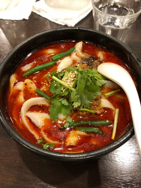 麻辣刀削麺 着席してから2分できましたwww かなり赤く見えますが辛さは大した事ないんですよ。(あくまでもバカ舌の私の感想です)しかし熱かった‼️で、辛くは感じてないんですけど、汗はダラダラ…ボリュームも凄かったんですが、完飲完食致しました。もちろん午後の仕事は辛かったです… 今度は定食食べてみようかな?ご馳走様でした。