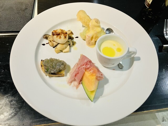 生シラスのブルスケッタ、帆立とキノコのソテー、北海道産ネギのフリットとエビ、スープ、生ハムメロン