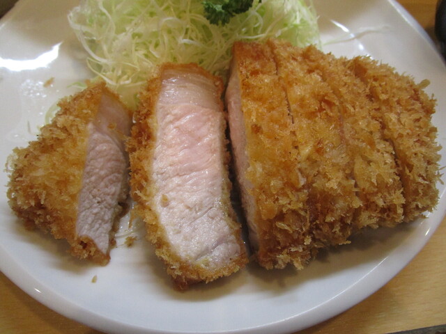 思ったよりも厚めのロースかつは、断面が若干ピンク色をしており、壁に無菌豚使用の旨が張り出されていたので安心して食べましたが、ジューシーで柔らかくなかなか美味しかったです。