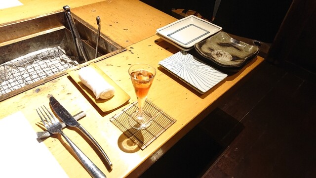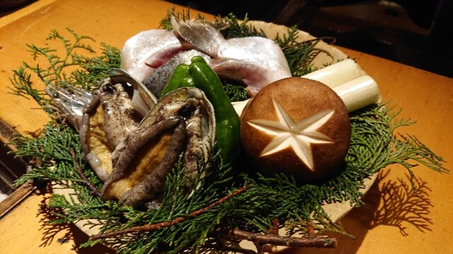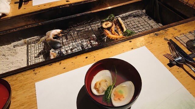 今回も炉端でのお料理を堪能しました。鮑、鮎、天使の海老、丸ごとのなすにピーマン、椎茸。素材そのものの味を楽しませてくれます。岩塩をほんの少し、野菜の味が引き立ちます。
