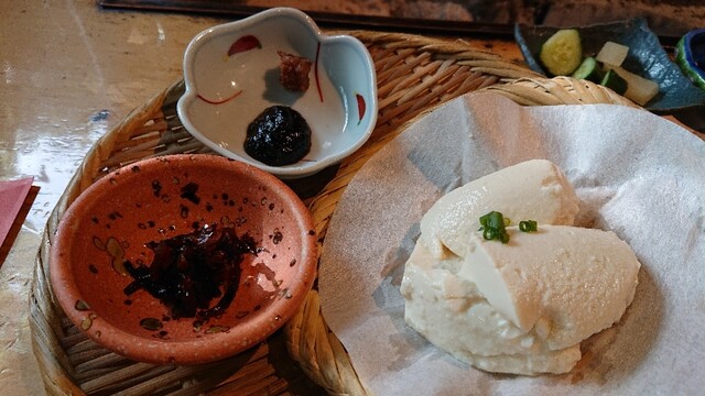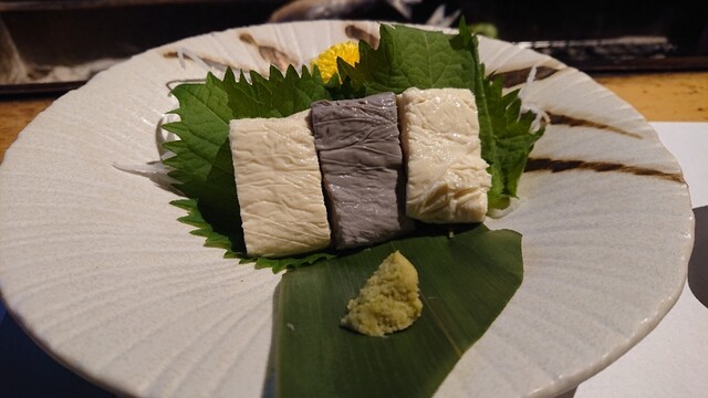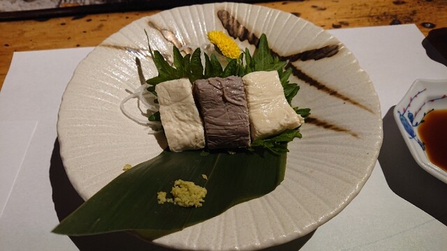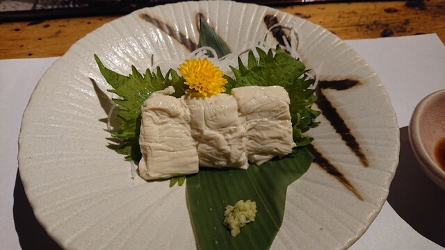 生湯葉。3種類の生湯葉です。普段、あまり食べない食材ですので、新鮮な感覚です。わさび醤油、岩塩でいただきます。大豆の甘味が心地よいです。
