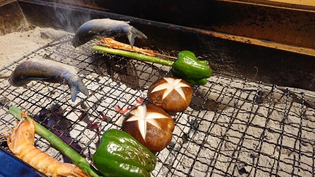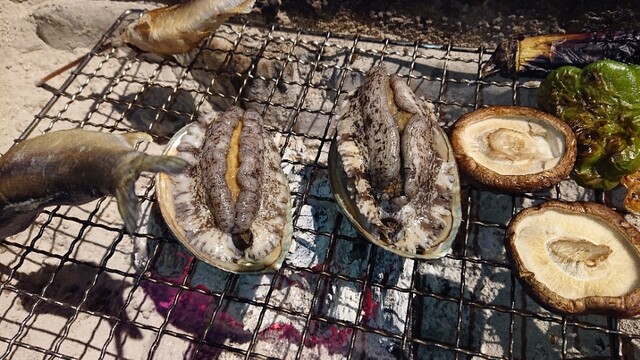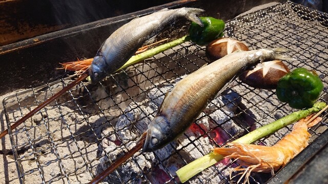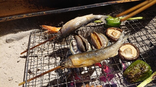 本日の炭火焼き。メインは鮑でしょうか。鮎、天使の海老、野菜はアスパラ、ピーマン、しいたけです。宿のご主人が、炭火でゆっくり焼いてくださいます。