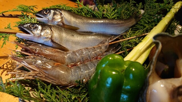 この季節は、鮑と鮎、海老です。なすにピーマン、椎茸が脇を固めます。